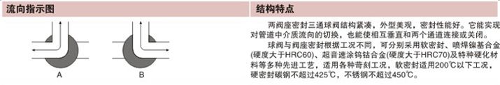 L型三通球閥隻能連接相(xiàng)互正交的(de)兩條管道,不能同(tóng)時保持第三條管道的相互連通,隻起分配作用。三通球閥一般采用兩閥座結構,亦可根據用戶要求采用四閥座結構。四閥座密封三通球閥具有(yǒu)造型美觀、結構緊湊合理